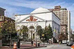 The First Unitarian Church is a historic church and congregation at 12 West Franklin Street in Mount Vernon, Baltimore, Maryland. Dedicated in 1818, it was the first building erected for Unitarians in the United States. The church is a domed cube with a stucco exterior.[3] The church, originally called the "First Independent Church of Baltimore", is the oldest building continuously used by a Unitarian congregation. The name was changed in 1935 to "The First Unitarian Church of Baltimore (Unitarian and Univeralist)" following the merger with the former Second Universalist Church at East Lanvale Street and Guilford Avenue in midtown Baltimore. The American Unitarian Association (founded 1825) and the Universalist Church of America (established 1866) representing the two strains of Unitarian Universalism beliefs and philosophies merged as a national denomination named the Unitarian Universalist Association in May 1961.