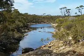 The northwest precinct of the park is referred to as Twertup, a name applied to several plants and features of the landscape. The Twertup Field Studies Centre, so named, previously occupied a former residence known as Twertup Cottage until the spongolite construction was destroyed by fire. Twertup is given in formal names associated with the area, for the watercourse Twertup Creek, a road, and several plant taxa, the Twertup mallee Eucalyptus arborella, Twertup feather-flower Verticordia crebra, and Leucopogon sp. Twertup for an unknown species described by K.R. Newbey that was found in the area.[5][6][7] The nineteenth century author Ethel Hassell, who lived nearby at Jerramungup station, gives a chapter with this title. A warning that the young woman should avoid staying in the area, while heeded, was mysterious about the actual threat. This was later explained by Hassel's Nyungar friend, Gimbuck, who now advised her to sleep with two fires and away from water because of the reputation of groups of 'wild dogs' (dingos) in the area; this practical concern was accompanied by the ancestral story of their abundance.[8]