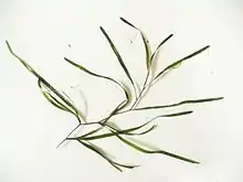 Potamogeton compressus produces a strongly flattened, robust, branching stem up to 90 cm in maximum length.[4] It grows annually from turions and seed, producing bushy plants branching near the surface with long, rather grass-like leaves that are 85–240 mm long and 3–6 mm wide and olive-green or dark green, sometimes with a reddish tinge near the surface.[4] Each leaf has two veins either side of the midrib and is bluntly pointed. The leaves have a rather opaque appearance compared to the transparent leaves of most pondweeds due to the presence of fibres called sclerenchymatous strands. There are no rhizomes or floating leaves.