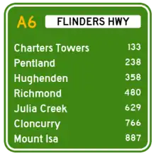 The Flinders Highway is a highway that crosses Queensland east to west, from Townsville on the Pacific coast to Cloncurry. The road continues as the Barkly Highway from Cloncurry to the Northern Territory border at Camooweal and beyond. The Flinders Highway passes a number of small outback towns and typical outback landscape predominates towards the inland. It was known as National Route 78 before Queensland began to convert to the alphanumeric system being adopted in Australia and is now designated as A6. The highway is also known as Overlanders Way.[1] Its entire length is part of the National Land Transport Network (formerly Auslink).[2]