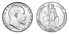 Both sides of the florin were redesigned following the accession of Victoria's son, Edward VII, each design being created by the Chief Engraver of the Royal Mint, George William de Saulles. The florin of King Edward VII was minted every year from 1902 to 1910. Its specifications remained at 11.3 grams weight and 28.5 millimetres diameter. The obverse shows the right-facing head of the King, inscribed EDWARDVS VII DEI GRA BRITT OMN REX FD IND IMP,[lower-alpha 5] while the other side features what Coincraft's Standard Catalogue of English and UK Coins deems "a most unusual and original reverse".[23] It shows a windswept figure of Britannia standing holding a shield with her left hand and a trident with her right, and inscribed ONE FLORIN TWO SHILLINGS, with the date below.[23] Peter Seaby, in his history of British coinage, described the figure of Britannia as "standing on some mythical ancient ship which could hardly be sea-worthy under her weight", but "a pleasing composition".[24]
