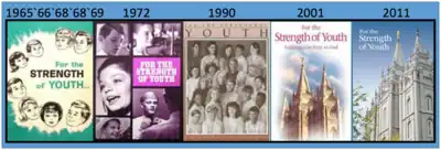 The LDS Church first published "For the Strength of Youth" in 1965.[1] Subsequent editions were published in 1966, two in 1968, 1969, 1972, 1990, 2001, 2011, and most recently in 2022 (10th edition).[2][1] The first edition of the pamphlet had 16 pages, while the ninth edition had 44 pages.[3] Regarding the 2011 version, Young Women general president Elaine S. Dalton said, "The standards have not changed, but times have changed.... For the Strength of Youth has been revised to address the issues youth face today — to teach them the doctrine behind the standards and the promised blessings of obedience."[4] The covers evolved from a depiction of a family in the first five editions to depictions of youth in the 1972 and 1990 versions,[5] which were replaced with images of the Salt Lake Temple in some editions, a reflection of what was called an "additional emphasis ... on living worthy to attend the temple" in the youth guidelines, while then returning to images of youth in the most recent version, released in 2022.[6] The 10th edition also added a subtitle with it, called "For the Strength of Youth: A Guide for Making Choices."[7] Dieter F. Uchtdorf, of the Quorum of the Twelve Apostles, stated the resource had been “refreshed to better cope with the challenges and temptations of our day.” He said the pamphlet will teach people eternal truths about who they are and who Christ is, as well as how people can make choices based on the truths taught.[8]