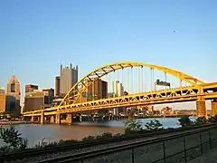 The Fort Pitt Bridge is a steel, double-decked bowstring arch bridge that spans the Monongahela River near its confluence with the Allegheny River in Pittsburgh, Pennsylvania. It carries Interstate 376 between the Fort Pitt Tunnel and Downtown Pittsburgh. Opened in June 1959 as a replacement for the Point Bridge, the Fort Pitt Bridge was the world's first computer-designed bowstring arch bridge[1]:00:02:43 and double-decked bowstring arch bridge.[2] The bridge is known for its difficult lane changes, especially on the lower level, often requiring people to go from the extreme left lane across two lanes to the extreme right lane in only 700 feet.[3] The upper level is more forgiving for some routes but still requires a full span lane change in 700 feet to get from the south side entrance to the downtown exits.
