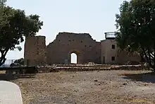 The interior was occupied by lean-to buildings whose roofs fed a central cistern of approximately 40m3 capacity. The surrounding wall, which reached a height of at least 11 m, supported a round walk and, certainly, crenellation. To the left of the door, traces of projecting stones suggest the presence of a staircase giving access to the round walk. In the north east corner, opposite the bridge, stored stones are witness to a project to build a keep, never completed. Three materials were used in the construction. Basalt was used for the centre of the surrounding walls, all of the upper parts and for the external enceinte. The basalt came from the digging of the moat. Volcanic breccia, a conglomerate, was used for the parts of walls above a height of 7 m. This rock was taken from a quarry on the east flank of the hill. Limestone from Pézenas was used in the construction of the cistern and the entrance door.[1]