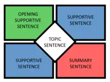 - Then, the student writes three sentences that develop the thesis of the central topic, placing one in each of the following squares: upper-left, upper-right, and lower-left. The upper-left square contains the opening supportive sentence, and the next two squares contain other supporting information.