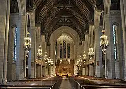 Cram designed and built the sanctuary however the parish house, cloister, manse, and garth, which lie to the south along Michigan Avenue, were designed by Howard Van Doren Shaw.[3] The church building is the oldest structure on North Michigan Avenue, with the exception of the Chicago Water Tower, and is listed on the National Register of Historic Places.[2]