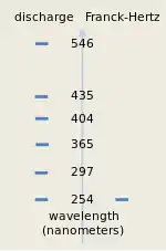 Franck and Hertz noted in their first paper that the 4.9 eV characteristic energy of their experiment corresponded well to one of the wavelengths of light emitted by mercury atoms in gas discharges. They were using a quantum relationship between the energy of excitation and the corresponding wavelength of light, which they broadly attributed to Johannes Stark and to Arnold Sommerfeld; it predicts that 4.9 eV corresponds to light with a 254 nm wavelength.[2] The same relationship was also incorporated in Einstein's 1905 photon theory of the photoelectric effect.[15] In a second paper, Franck and Hertz reported the optical emission from their tubes, which emitted light with a single prominent wavelength 254 nm.[7] The figure at the right shows the spectrum of a Franck–Hertz tube; nearly all of the light emitted has a single wavelength. For reference, the figure also shows the spectrum for a mercury gas discharge light, which emits light at several wavelengths besides 254 nm. The figure is based on the original spectra published by Franck and Hertz in 1914. The fact that the Franck–Hertz tube emitted just the single wavelength, corresponding nearly exactly to the voltage period they had measured, was very important.[13]