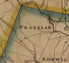 The West Farms and Pautipaug Societies were incorporated from Norwich as the Town of Franklin in 1786.[6][7][8] The town is named after Benjamin Franklin.[8] Until 1861 the town's borders extended east to the Shetucket River and included the early village of Baltic, Connecticut. That year, the town of Sprague, Connecticut was incorporated from the towns of Franklin and Lisbon, Connecticut which gave Franklin its present bounds.[9]