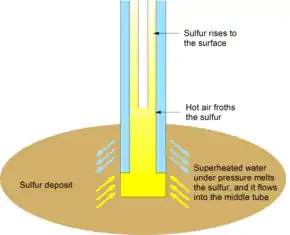 In the Frasch process, three concentric tubes are introduced into the sulfur deposit. Superheated water (165 °C, 2.5-3 MPa) is injected into the deposit via the outermost tube. Sulfur (m.p. 115 °C) melts and flows into the middle tube. Water pressure alone is unable to force the sulfur into the surface due to the molten sulfur's greater density, so hot air is introduced via the innermost tube to froth the sulfur, making it less dense, and pushing it to the surface.[1]