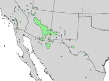 In Arizona, the range of Fraxinus velutina is centered on the Mogollon Rim, from the northwest in the Grand Canyon feeder canyons of southern Utah and Nevada, to the central-east White Mountains (Arizona) merging into the same mountainous area of western New Mexico, then to the Rio Grande valley south to trans-Pecos Texas. In Arizona and northern Sonora it also is found in the sky island mountain ranges, the Madrean Sky Islands, and is found from central-southern Arizona, in the Sonoran Desert mountains, and the desert ranges south into northern Sonora and the very north of the Sierra Madre Occidental cordillera of Sonora and Chihuahua. Scattered populations occur eastward through the Chihuahuan Desert regions of Chihuahua, Coahuila and Nuevo León.[5]