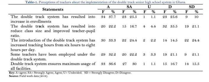 - 1 2 3 Mensah, D. (2019). Teachers’ Perspective on Implementation of the Double Track Senior High School System in Ghana. International Journal Of Emerging Trends In Social Sciences, 5(2), 47-56. pp. 47-56. doi:10.20448/2001.52.47.56