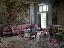Mid-18th century "Louis XV" seat furniture, with integrated flowing lines, and a lacquer-veneered Parisian commode, mounted in gilt bronze, (Château de Talcy)