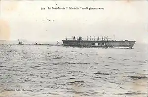 The French submarine Mariotte was a submarine built for the French Navy prior to World War I. Intended to accompany the fleet, she was designed for high speed on the surface. Although the navy was unsatisfied with her performance on the surface, the boat had a higher underwater speed than any French submarine before or during the following 35 years. Mariotte was plagued with engine problems during her construction and the navy spent years fixing the various issues before finally commissioning her five years after beginning construction. During the war, she participated in the Dardanelles Campaign, but had to be scuttled after she became entangled in the cables of a minefield on her first attempt to penetrate the Dardanelles.