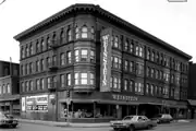 The Friedrich Block occupies a prominent location in downtown Holyoke, at the northwest corner of Main and Sargent Streets. It is a four-story brick structure with a diversity of Renaissance Revival styling on its street-facing exteriors. The ground floor is finished mainly in dressed brownstone, although it as also been significantly altered by its commercial tenants over the years. The upper floors are organized into groups of window bays set in brick, with intervening slightly projecting bay windows finished in metal. The brick is laid to give a banding effect, which alters to form keystone-like forms above the windows. Windows on the second and third floors are set in rectangular openings, while those on the third floor are set in round-arch openings. The building is crowned by a projecting metal cornice, with garlanding, dentil work and modillions.[2]
