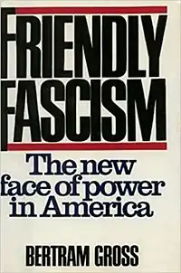 Friendly Fascism: The New Face of Power in America is a book written by Bertram Gross, American social scientist and professor of political science at Hunter College. The book was published on June 1, 1980, by M. Evans & Company as a 419-page hardback book containing 440 quotations and sources. It examines the history of fascism and, based on the growth of big business and big government, describes possible political scenarios for a future United States.[1][2][3] According to a 1981 review in the journal Crime and Social Justice, the book is described as "timely" on a subject requiring serious consideration. It is about the dangers of fascism, focusing primarily on the United States, but being aware that monopoly capitalism needs to be understood internationally since capitalism "is not a national mode of production".[4]