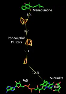 Pathway for electron tunneling across the fumarate reductase with distances labeled in Angstroms.[1]