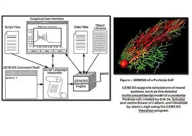 GENESIS (The General Neural Simulation System) is a simulation environment for constructing realistic models of neurobiological systems at many levels of scale including: sub-cellular processes, individual neurons, networks of neurons, and neuronal systems. These simulations are “computer-based implementations of models whose primary objective is to capture what is known of the anatomical structure and physiological characteristics of the neural system of interest”.[4] GENESIS is intended to quantify the physical framework of the nervous system in a way that allows for easy understanding of the physical structure of the nerves in question. “At present only GENESIS allows parallelized modeling of single neurons and networks on multiple-instruction-multiple-data parallel computers.”[5] Development of GENESIS software spread from its home at Caltech to labs at the University of Texas at San Antonio, the University of Antwerp, the National Centre for Biological Sciences in Bangalore, the University of Colorado, the Pittsburgh Supercomputing Center, the San Diego Supercomputer Center, and Emory University.