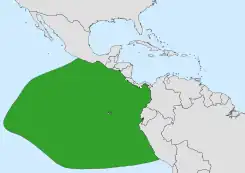 The Galápagos petrel is endemic to the Galápagos Islands.[2] They are mainly distributed in the Galápagos Marine Reserve area, but studies revealed that individuals frequently leave the reserve and disperse northeast towards South America and up to 2000 km southwards in the period between January and February.[5][11] Like other gadfly petrels, these subtropical seabirds are highly pelagic and are maladapted to the terrestrial habitats.[6] Therefore, they are usually found far from the land and will only return to their nest to breed.[6]