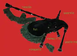 The word gaita is used across northern Spain as a generic term for "bagpipe", although in the south of Spain and Portugal it denotes a variety of horn, flute or oboe like instruments according to region.
