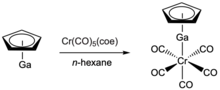 Like (pentamethylcyclopentadienyl)gallium(I), cyclopentadienylgallium can also coordinate to transition metal complexes such as Cr(CO)5(cyclooctene) or Co2(CO)8 to yield CpGa–Cr(CO)5 or (thf)GaCp{Co(CO)4}2.[24] For CpGa–Cr(CO)5, the Ga-Cr bond length (239.6 pm) is similar to that for a (pentamethylcyclopentadienyl)gallium(I) analogue (240.5 pm). For this complex, the trans effect is also observed, where the Cr-CO bond trans to the cyclopentadienylgallium ligand is contracted (186 pm) relative to the cis Cr-CO bonds (189.5 pm). While cyclopentadienylgallium can act as a terminal ligand similar to (pentamethylcyclopentadienyl)gallium(I), it was determined that cyclopentadienylgallium analogues react faster than their (pentamethylcyclopentadienyl)gallium(I) counterparts. This can be attributed to the lower steric bulk of cyclopentadienylgallium.[24]