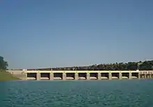 The Gandhi Sagar Dam is one of the four major dams built on India's Chambal River. The dam is located in the Mandsaur, districts of the state of Madhya Pradesh. It is a masonry gravity dam, standing 62.17 metres (204.0 ft) high,[1] with a gross storage capacity of 7.322 billion cubic metres from a catchment area of 22,584 km2 (8,720 sq mi). The dam's foundation stone was laid by Prime Minister of India Pandit Jawaharlal Nehru on 7 March 1954,[2] and construction of the main dam was done by leading contractor Dwarka Das Agrawal & Associates and was completed in 1960. Additional dam structures were completed downstream in the 1970s.