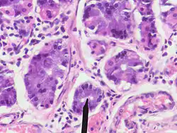 A gastric chief cell (or peptic cell, or gastric zymogenic cell) is a type of gastric gland cell that releases pepsinogen and gastric lipase. It is the cell responsible for secretion of chymosin in ruminant animals and humans.[1] The cell stains basophilic upon H&E staining due to the large proportion of rough endoplasmic reticulum in its cytoplasm. Gastric chief cells are generally located deep in the mucosal layer of the stomach lining, in the fundus and body of the stomach.[2][3]