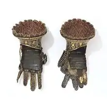 A gauntlet is a type of glove that protects the hand and wrist of a combatant. Gauntlets were used particularly in Europe between the early fourteenth century and the early modern period and were often constructed of hardened leather or metal plates.