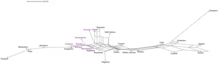 A phylogenetic analysis determines that the population of Haskovo Province has shorter genetic distance against the population of the Czech Republic than to the Bulgarian provinces, and that only the population of Burgas Province is closer to Haskovo than the Hungarian population, furthermore only datasets of two more Balkan or Slavic foreign populations(Greece and Croatia) are used and all other Slavic populations are excluded from this analysis.[46] The largest-scale study of the Hungarians (n=230) determined that[47] the remaining Finno-Urgic peoples are genetically their furthest populations, and clearly confirmed that the closest Europeans to the Hungarians are the Bulgarians, however the same study determines the Yugoslavs as the nearest population to Bulgarians.[48] According to DNA data for 17 Y-chromosomal STR loci in Macedonians, the Macedonian population has the lowest genetic distance against the Bulgarian population (0.0815).[49]