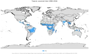 Worldwide zones of Tropical savanna climate (Aw).