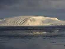 Wilczek Land is barren and its basaltic rock cliffs are exposed.[13][25] It lies to the northeast of Hall Island, across the Austrian Strait.[7] It is the second largest island of the Franz Josef Archipelago and is almost completely glaciarized except for two narrow areas along its western shores. The highest point on the island is 606 metres (1,988 ft), in the western central part.[7] This large island is named after Austro-Hungarian Count Johann Nepomuk Wilczek, involved in the Austro-Hungarian North Pole Expedition. This island should not be confused with small Wilczek Island, located southwest of Salm Island and named after the same person. Mys Ganza is Wilczek Land's westernmost cape. Cape Geller was the wintering site for two members of the 1899 Wellman expedition. Left with minimal supplies, one of them did not survive.[26]