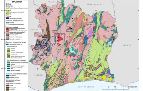 The geology of Ivory Coast is almost entirely extremely ancient metamorphic and igneous crystalline basement rock between 2.1 and more than 3.5 billion years old, comprising part of the stable continental crust of the West African Craton.[2] Near the surface, these ancient rocks have weathered into sediments and soils 20 to 45 meters thick on average, which holds much of Ivory Coast's groundwater. More recent sedimentary rocks are found along the coast. The country has extensive mineral resources such as gold, diamonds, nickel and bauxite as well as offshore oil and gas.[3]