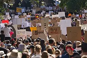 Shortly after protests began in the United States in late May 2020 seeking justice for George Floyd, an African-American who was murdered during an arrest by Minneapolis police, people in Australia protested to show solidarity with Americans and the Black Lives Matter movement, as well as to demonstrate against issues with police brutality and institutional racism, racism in Australia, and Aboriginal deaths in custody.[1] Vigils and protests of thousands of participants took place nationwide.