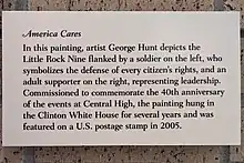 In 2005, Hunt's 1997 painting "America Cares/the Little Rock Nine" was selected for a set of U.S. Postal Service stamps commemorating milestones in the Civil Rights Movement. The image depicts the nine students who became the first African Americans to attend Central High School in Little Rock, Arkansas in 1957 after the Supreme Court declared segregated schools unconstitutional in Brown v. Board of Education. The painting was originally commissioned for the interpretive center at the Little Rock Central High School National Historic Site. Then President Clinton and his first lady asked to hang it in the White House while the interpretation Center was under construction; it remained in the White House for five years until its permanent installation back in Little Rock. The painting in the case as it hangs on the wall is 54.5" tall by 66" wide. [6]
