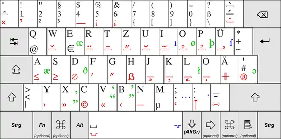 In addition, DIN 2137-1:2012-06 defines a layout "T3", which is a superset of "T2" incorporating the whole "secondary group" as defined in ISO/IEC 9995-3:2010. Thus, it enables to write several minority languages (e.g. Sami) and transliterations, but is more difficult to comprehend than the "T2" layout, and therefore not expected to be accepted by a broad audience beyond experts who need this functionality.