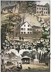 Pictures from Old Germantown: the Pastorius family residences are shown on the upper left (c. 1683) and upper right (c. 1715), the center structure is the house and printing business of the Caurs family (ca. 1735), and the bottom structure is the market place (c. 1820).