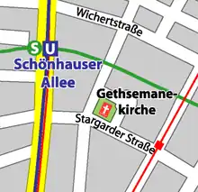 Gethsemane Church is located at the crossroads of Stargarder Straße with Greifenhagener Straße, about 100 meters east of the Schönhauser Allee, close to the combined S-Bahn and Underground station of the same name. The church building is oriented east-west, and its western tower forms a decorative façade onto the crossroads. Gethsemanestraße, named after the church, surrounds the choir at the eastern side of the building, and its northern side, forming with the two other streets a kind of a square around the church.