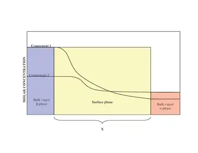In the presence of two phases (α and β), the surface (surface phase) is located in between the phase α and phase β. Experimentally, it is difficult to determine the exact structure of an inhomogeneous surface phase that is in contact with a bulk liquid phase containing more than one solute.[2] Inhomogeneity of the surface phase is a result of variation of mole ratios.[1] A model proposed by Josiah Willard Gibbs proposed that the surface phase as an idealized model that had zero thickness. In reality, although the bulk regions of α and β phases are constant, the concentrations of components in the interfacial region will gradually vary from the bulk concentration of α to the bulk concentration of β over the distance x. This is in contrast to the idealized Gibbs model where the distance x takes on the value of zero. The diagram to the right illustrates the differences between the real and idealized models.