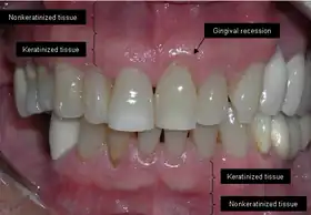 Exposure of the tooth root due to loss of keratinized tissue around the neck of a tooth is referred to as gingival recession. This can result in sensitivity or pain from the exposed tooth root surface (dentin is more permeable and soft compared to enamel and dentin is what makes up the tooth root).[7] Recession may also cause an unasthetic appearance especially if located in the anterior dentition (front teeth). While not all cases of gingival recession require surgical correction, there are various options if that is what the patient desires.[8] It should be reinforced that recession left untreated will not result in tooth loss, contrary to popular belief. Also, recession that is left untreated can be maintained and the inflammation kept at bay with proper brushing and oral hygiene technique.[5] On the other hand, if one desires to pursue corrective therapy, there are a wide variety of techniques ranging from autograft (your own tissue, usually taken from the palate), allograft (someone else's tissue, cadaver), xenograft (animal, usually porcine or bovine) or simply repositioning of the tissue native to the site.[9] The benefits of corrective therapy often result in decreased sensitivity through coverage of the root surface in addition to a gain in the keratinized tissue mentioned beforehand.