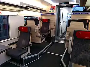 The low-floor entrances allow step-free access from platforms at heights between 550 mm (22 in) and 760 mm (30 in) and several accessible toilets and areas for wheelchairs are available, allowing the train to comply with the Law on Equal Rights for Persons with Disabilities.[21] As a long-distance train, it also features signal boosters for 3G/4G cellular phone networks, power sockets (for Swiss and international plugs) and large luggage racks for passenger comfort, along with energy-efficient lighting. The interior is flexible, meaning it can be extensively refitted and modified to an operator's requirements.[20]