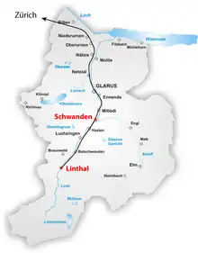 After leaving Zurich, the Glarner Sprinter ran along the west side of Lake Zürich, stopping only at Pfäffikon and Ziegelbrücke. From Ziegelbrücke it followed the valley of the Linth River, stopping at all intermediate stations including those for Glarus Town and Schwanden. On weekends and public holidays, the train then ran without stopping to Linthal; on other days it terminated at Schwanden.[2][3]