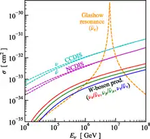 Cross sections between neutrinos and 16O for W-boson production, compared to those for charged-current (CC) and neutral current (NC) deep inelastic scattering (DIS), and the predicted Glashow resonance.[2]