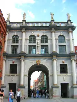 The Golden Gate (Polish: Złota Brama, German: Langgasser Tor) is a historic Renaissance city gate in Gdańsk, Poland. It is located within the Royal Route, the most prominent part of the historic city center and is one of its most notable tourist attractions.[1]