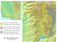 Genetic studies have since clarified three groups of trout native to the Kern River: California golden trout (O. m. aguabonita) native to the South Fork Kern River and Golden Trout Creek (tributary to the Kern River mainstem but the historic course of the South Fork Kern River and now only separated from it by a lava flow and ridge of sediment), Little Kern River golden trout (O. m. whitei), and Kern River rainbow trout (O. m. gilberti).[17]