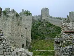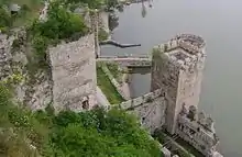 Golubac's early history is uncertain. From 803 to 1018, the area belonged to the First Bulgarian Empire, to the Byzantine Empire from then until 1193, and the Second Bulgarian Empire until 1257. The area remained in Serbian hands from then until the Ottoman conquest in the 15th century, with control of the region changing many times between Hungarians, Bulgarians and Serbs before then. It is also unclear whether the medieval fortress was built by Bulgarians, Serbs or Hungarians,[6][10] or how many towers it had originally. However, an Orthodox chapel built as part of one tower shows that it, at least, was built by a local noble. There is also uncertainty about when construction started, although it is generally agreed that the majority of the fortress was built early in the 14th century.[4][5][7] The chapel probably originated from the period of Despot Stefan Lazarević in the first half of the 15th century.[3]