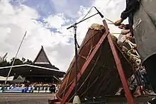 Gordang sambilan is a kendang (Indonesian version of drum) musical instrument originating from North Sumatra, Indonesia.[1] Gordang sambilan consists of nine relatively large and long drums (drum chime) made of ingul wood and played by four people. The size and length of the nine drums are stratified, starting from the largest to the smallest.