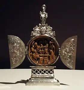 A triptych altarpiece (MMA 17.190.453) in the Metropolitan Museum of Art has a compartment (receptacle) for holding relics that is covered by a hinged disc.[81][66] An especially detailed and complex 25.1 cm high triptych catalogued as WB.232 in the British Museum, credited to the workshop of Adam Dircksz, contains two triptychs on upper and lower registers. The upper, far larger register consists of a central panel with a background Crucifixion and numerous foreground figures; a Resurrection, Entombment, and other scenes are on the right-hand wing, while depictions of Christ Carrying the Cross and the Sacrifice of Isaac are the main features of the left wing.[29]