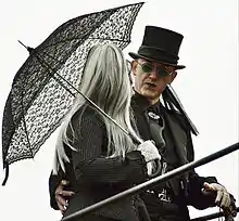 One female role model is Theda Bara, the 1910s femme fatale known for her dark eyeshadow.[6][7] Siouxsie Sioux was particularly influential on the dress style of the gothic rock scene; Paul Morley of NME described Siouxsie and the Banshees' 1980 gig at Futurama: "[Siouxsie was] modeling her newest outfit, the one that will influence how all the girls dress over the next few months. About half the girls at Leeds had used Sioux as a basis for their appearance, hair to ankle."[8] Robert Smith,[9] Musidora, Bela Lugosi,[10] Bettie Page, Winona Ryder, Vampira, Morticia Addams,[7] Nico, Rozz Williams, David Bowie,[1] Lux Interior,[1] Dave Vanian,[11] are also style icons. The 1980s established designers such as Drew Bernstein of Lip Service, while the 1990s saw a surge of US-based gothic fashion designers, many of whom continue to evolve the style through the current day. Style magazines such as Gothic Beauty have given repeat features to a select few gothic fashion designers who began their labels in the 1990s, such as Kambriel, Rose Mortem, and Tyler Ondine of Heavy Red.[12] Influential goth models include Wednesday Mourning and Lady Amaranth.
