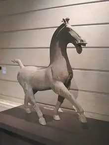 The Minister Coachman (Taipu 太僕), also known as the Grand Coachman, was responsible for the maintenance of imperial stables, horses, carriages and coachhouses for the emperor and his palace attendants, and for the supply of horses for the armed forces.[87] His latter duty entailed the supervising of large breeding grounds of frontier pastures, tended by tens of thousands of government slaves.[88] By the reign of Emperor Wu of Han (r. 141–87 BC) these contained 300,000 warhorses intended for use in campaigns against the nomadic Xiongnu Confederation.[89] Some of the Minister Coachman's subordinates managed stables outside the capital city. These stables housed Ferghana horses that were imported or gathered as tribute from Central Asian countries.[90]