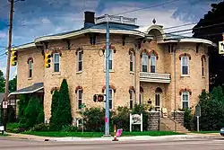 The Graham House is a two-story yellow brick Italianate structure on a stone foundation, built as a two-family dwelling. It has a bracketed roof with a wide overhang. The front facade is symmetrical, with each half of the duplex mirrored. The facade is divided into three sections: a flat center section with a projecting curved wing on each side. The center section contains a front porch on the first floor with a balcony above, both of which run the width of the section. The doors and windows of the center section are within rounded arches; the roofline above has a similar rounded section.[3]