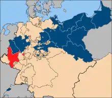 The Lower Rhine Province (red), within the Kingdom of Prussia (blue), within the German Confederation (member states in tan)
